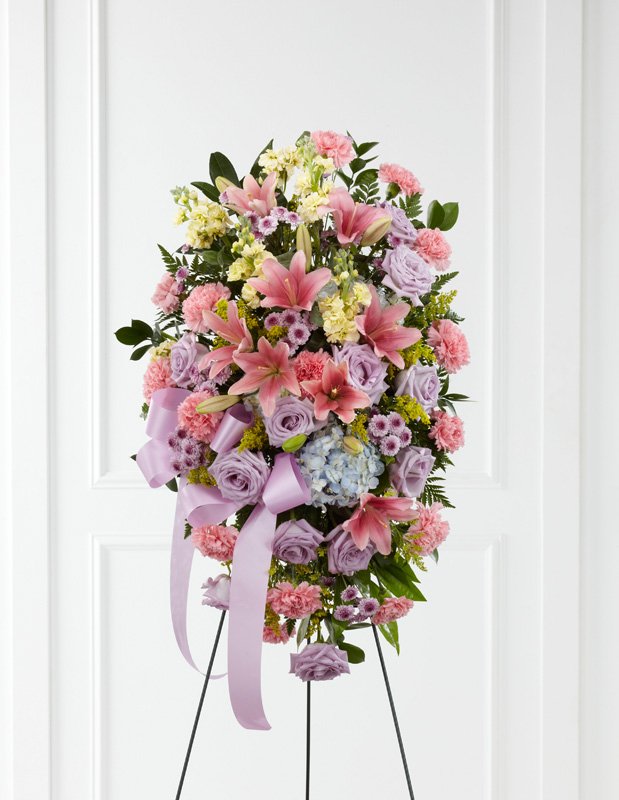 The Blessings of the Earth™ Easel is a soft and serene arrangement that elegantly honors the life of the deceased. Lavender roses, pink carnations, pink Asiatic lilies, blue hydrangea, yellow stock, lavender button poms, solidago and lush greens are beautifully accented with a lavender satin ribbon and displayed on a wire easel to create a gorgeous display for their memorial service. Stand not included.