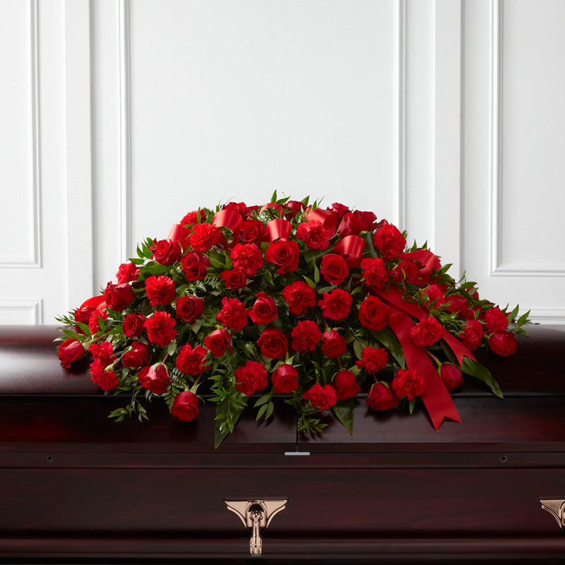 An exquisite all-red full casket spray, showcasing lavish cascades of velvety red roses and fluffy red carnations, complemented by accents of Italian ruscus and delicate foliage throughout and generous loops of red ribbons that gracefully spill from the top. Allow your cherished one to embark on their journey to the afterlife in timeless elegance with the 'Dearly Departed Casket Spray.' The opulent red hues lend a touch of grace and beauty that enhance the visual ambiance of your perished beloved’s last honours.