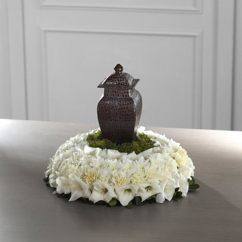 An exquisite and contemporary all-around floral tribute crafted to elegantly showcase the funeral urn. In this remarkable display, the ashes rest atop a lush bed of moss, surrounded by a graceful ring of gladiolus blooms. A thick layer of flat mums gently slopes down to a final layer of vibrant gladiolus blooms, all thoughtfully framed by lush foliage. The 'Encircling Grace Arrangement' is a modern masterpiece, offering a dignified and heartfelt tribute to a cherished loved one, making their ashes the graceful centerpiece of the celebration.