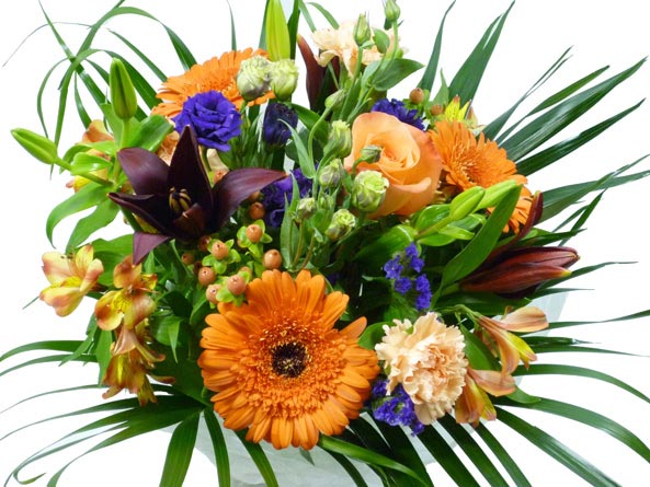 A colourful bouquet featuring Lisianthus, Hypericum Berries, Gerberas and exotic greens