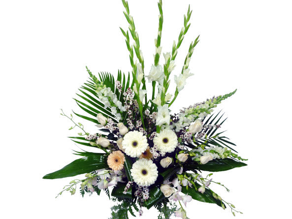 A funeral container arrangement filled with Roses, Snap Dragons, Orchids, Gladiolas, Gerberas, filler and greens