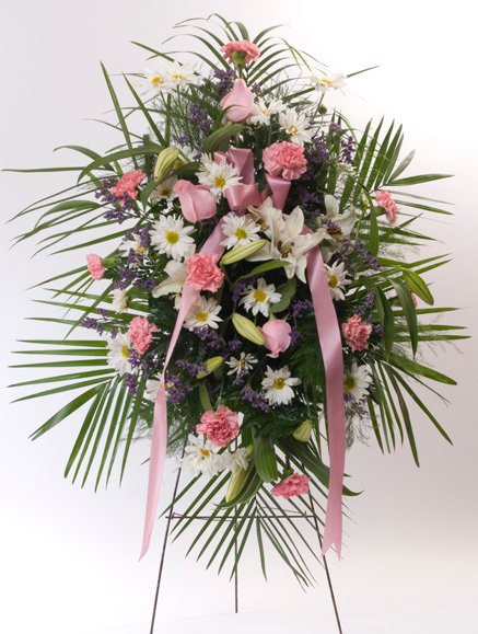 Time to Eternity Spray contains beautiful Lilies, Daisies, Carnations, Statice greens and Roses. Stand not included.