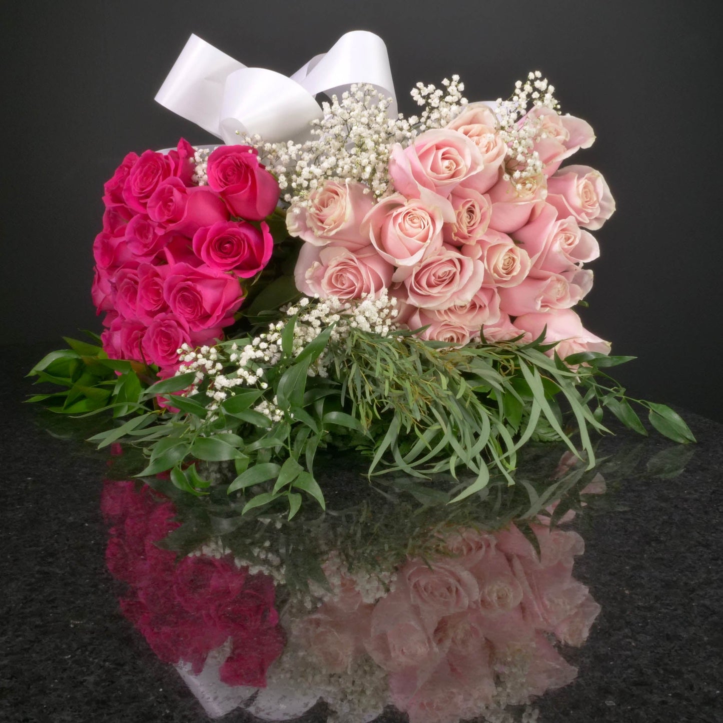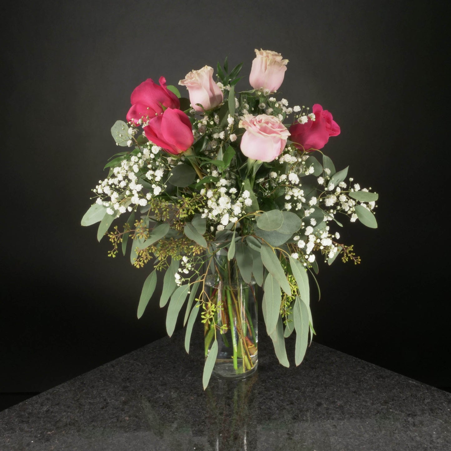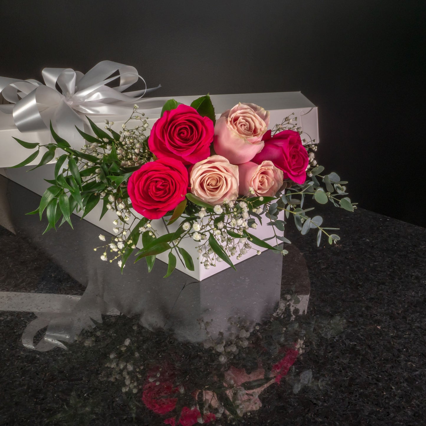 Half a dozen mixed blush pink and hot pink roses delicately accented with a touch of leather fern and Israeli ruscus carefully arranged in a hand tied bouquet with a beautiful wrap finish