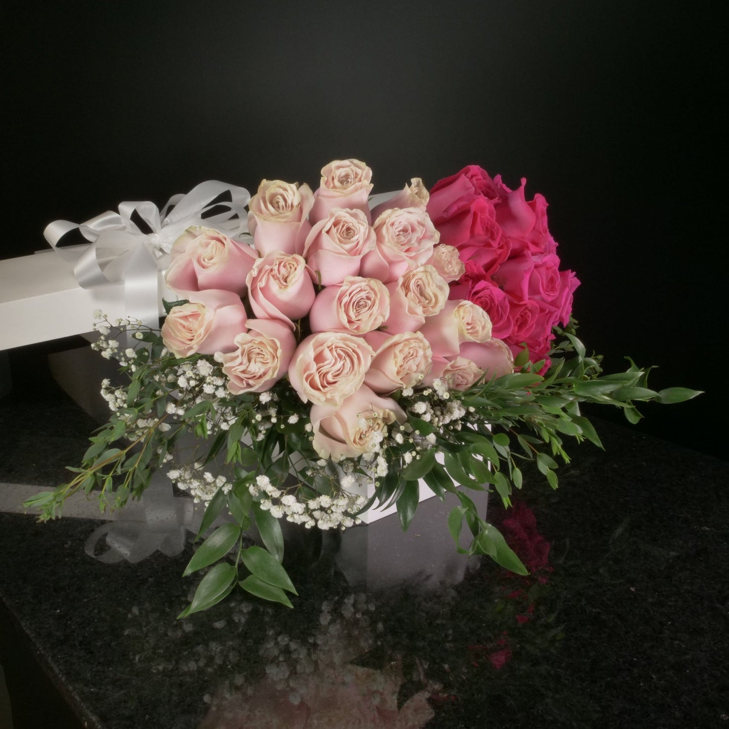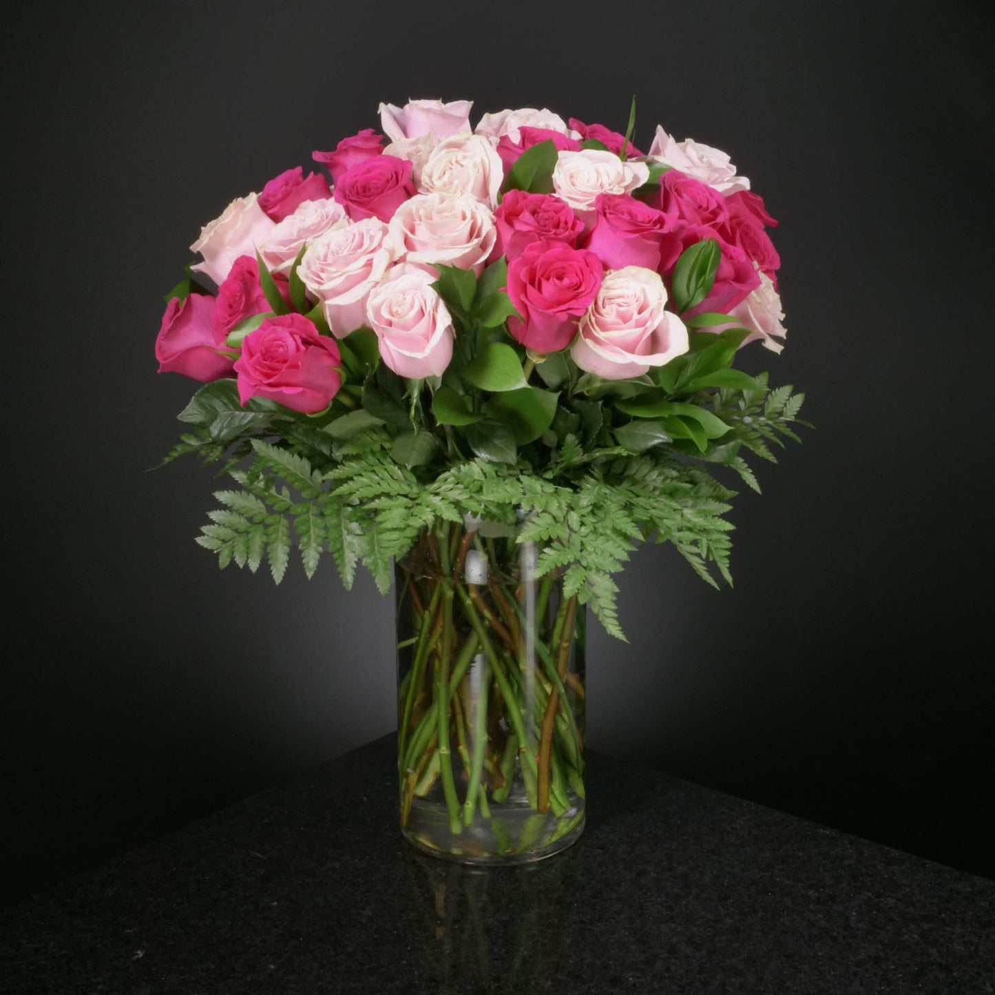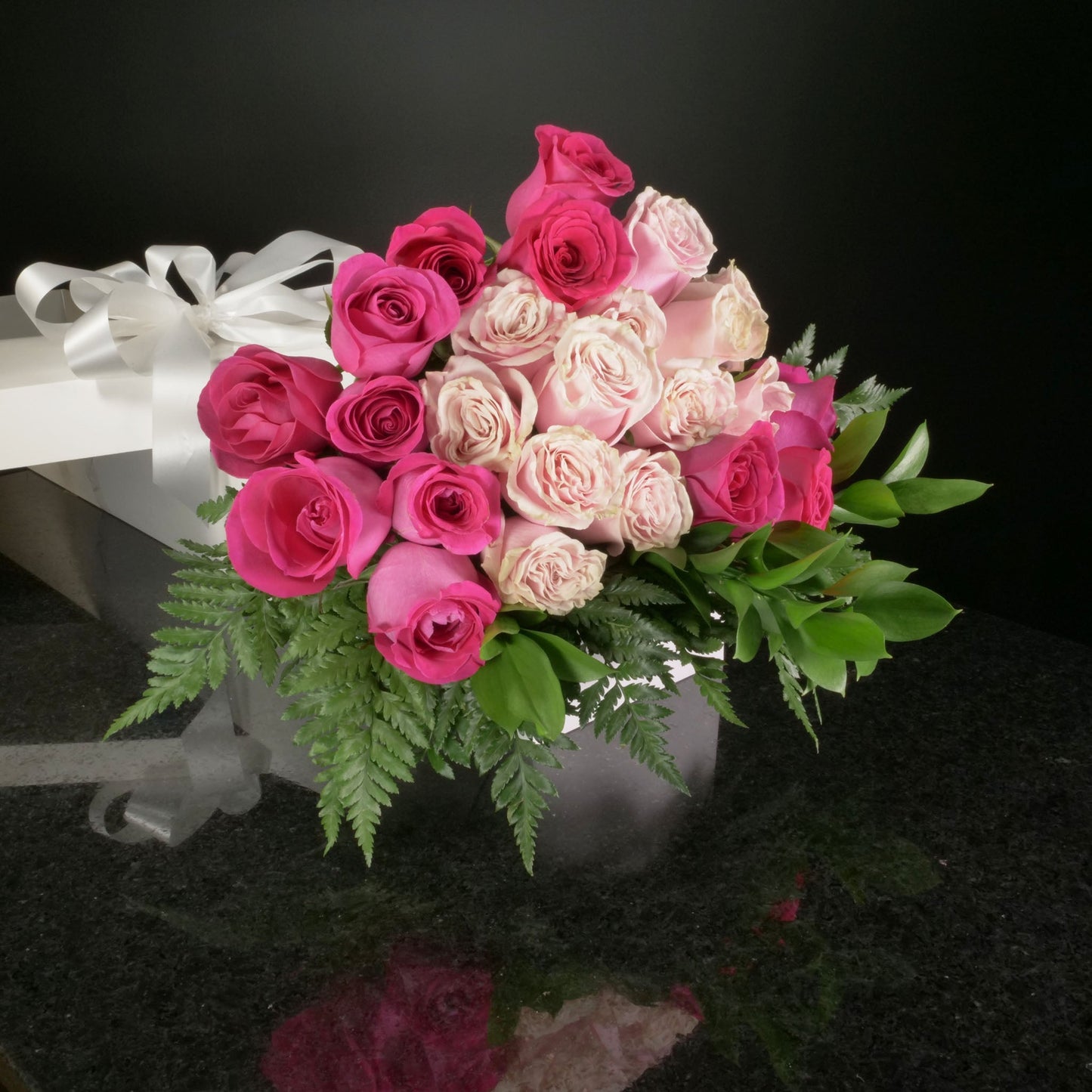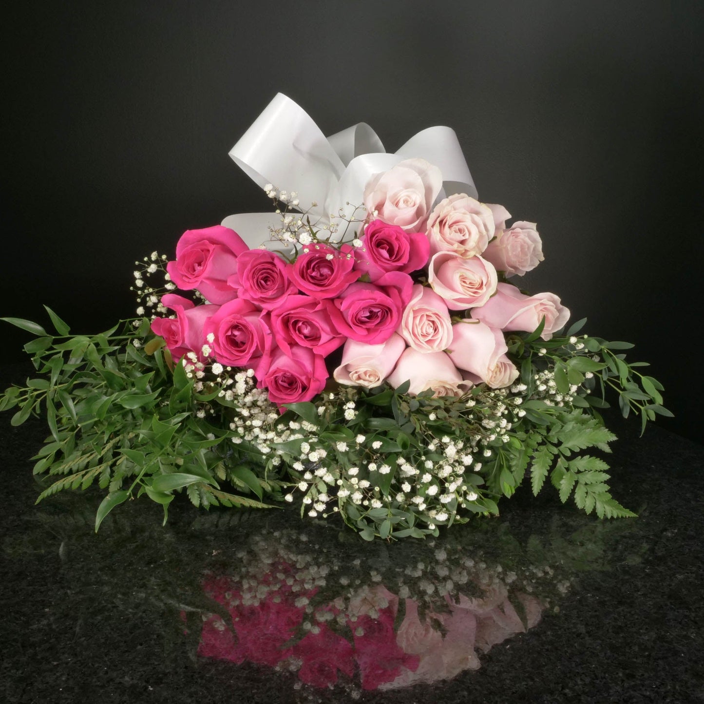 Half a dozen mixed blush pink and hot pink roses delicately accented with a touch of leather fern and Israeli ruscus carefully arranged in a hand tied bouquet with a beautiful wrap finish