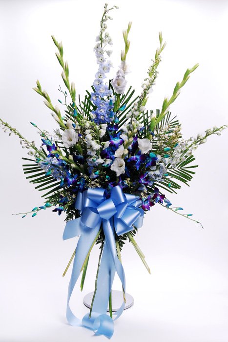 This funeral spray features Delphiniums, Orchids, Gladioas and tropical greens. Stand not included.