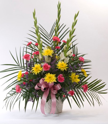 This funeral container is filled with Fuji Mums, Glads, Carnations, Filler, greens