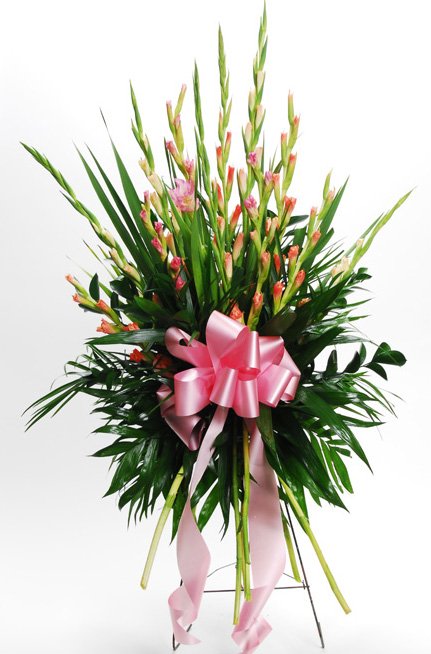 The Tender Thoughts spray features Gladiolas, mixed greens and a ribbon
