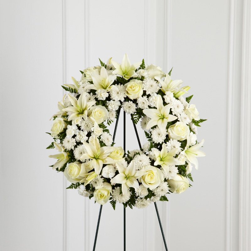 The Treasured Tribute™ Wreath offers peaceful wishes of heartfelt sympathy with each delicate bloom. Bright white roses, Asiatic lilies, mini carnations and cushion poms are beautifully arranged to form an elegant accented with lush and vibrant greens. Displayed on a wire easel, this gorgeous tribute is a wonderful symbol of eternal life and sweet serenity. Approximately 22 inches in diameter.